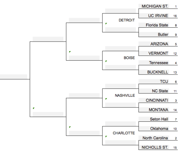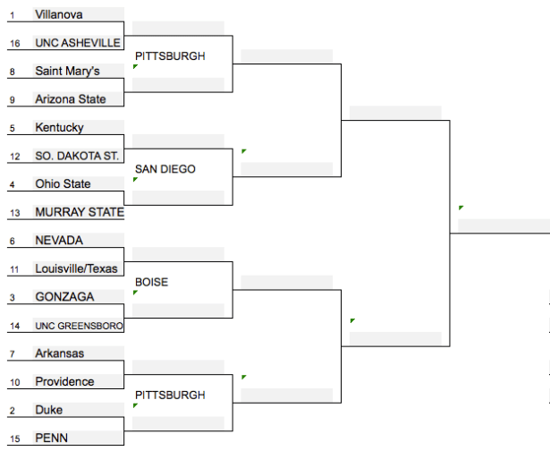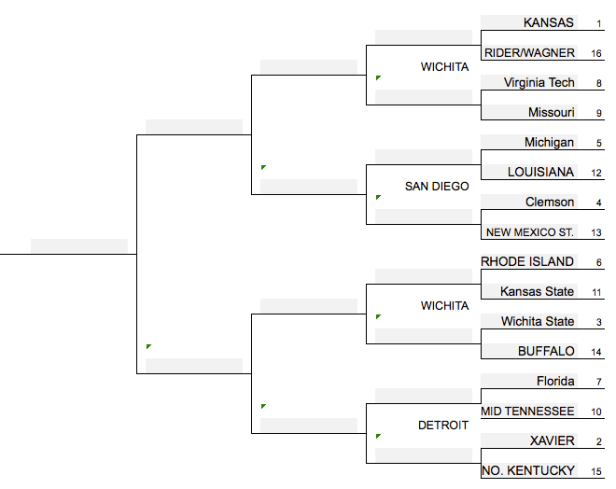 Conference champions are listed in ALL CAPS. NCAA Selection Committee bracket principles are used, including the new Quadrant System. In this iteration of the bracket, winners of the South and West regionals would meet in the Final Four, and the winners of the Midwest and East would face off.
