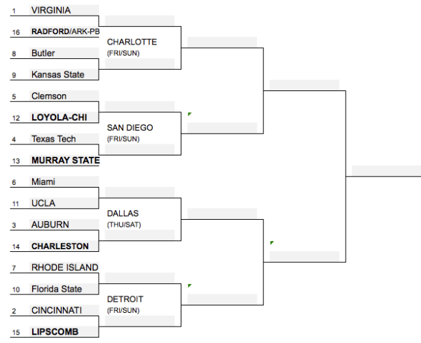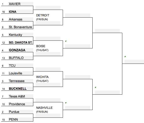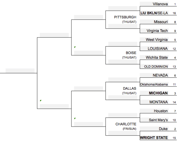 In this version of the bracket, the winner of the South Regional will meet the winner of the West in the Final Four, while the winners of the East and Midwest Regionals will face off in San Antonio.